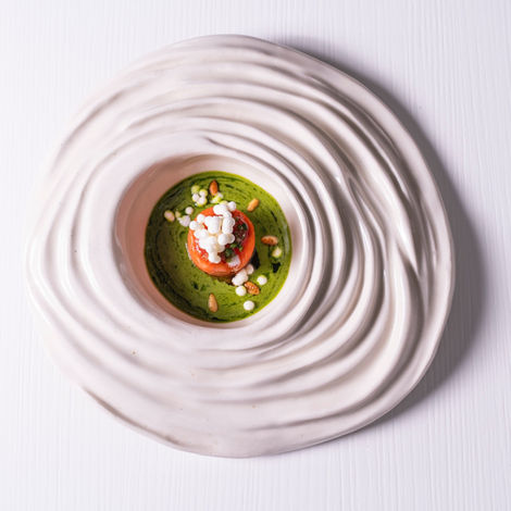 La colaboración con Meloni se desarrolla desde ese mismo espíritu experimental. Cocina y cerámica se encuentran en un proceso compartido de prueba, ajuste y búsqueda, donde las piezas se piensan en diálogo directo con los platos.